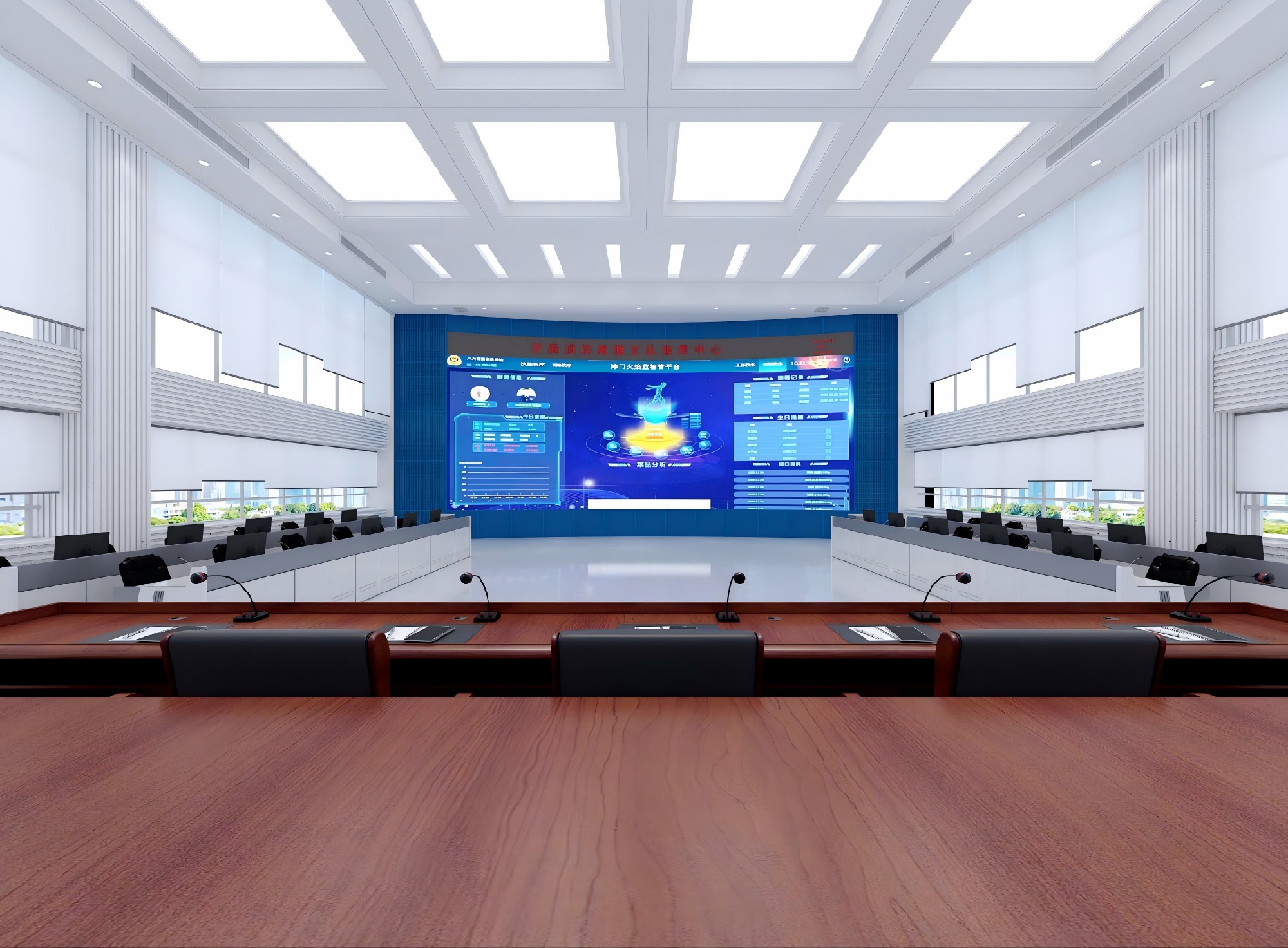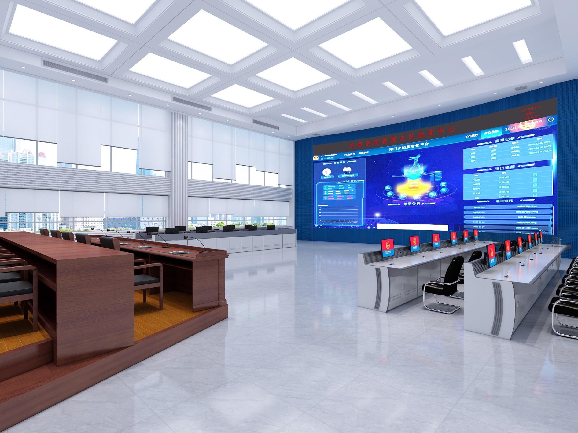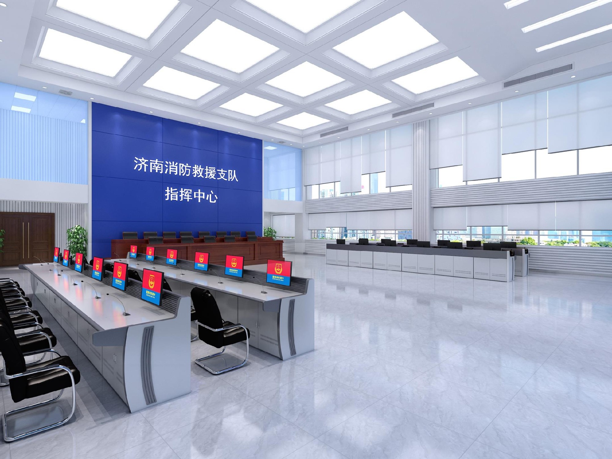 济南消防救援支队指挥中心以 “专业应急指挥中枢” 为核心定位。空间上采用 “大屏核心、多席联动” 的布局,挑高格局搭配规整的方格吊顶灯,浅灰、白色基底与深色木作、蓝色主题墙形成专业且庄重的视觉秩序,既满足日常值守的高效运转,也能承载应急会商、跨部门联动等复杂场景。智能化方面,核心大屏整合全域感知数据,结合各工位专业终端与 AI 辅助研判功能,实现 “一屏观全域、一键调资源” 的快速响应,同时冗余供电、智能安防等系统也保障了极端状况下的运行安全,整体实现了功能性、安全性与科技感的深度融合。