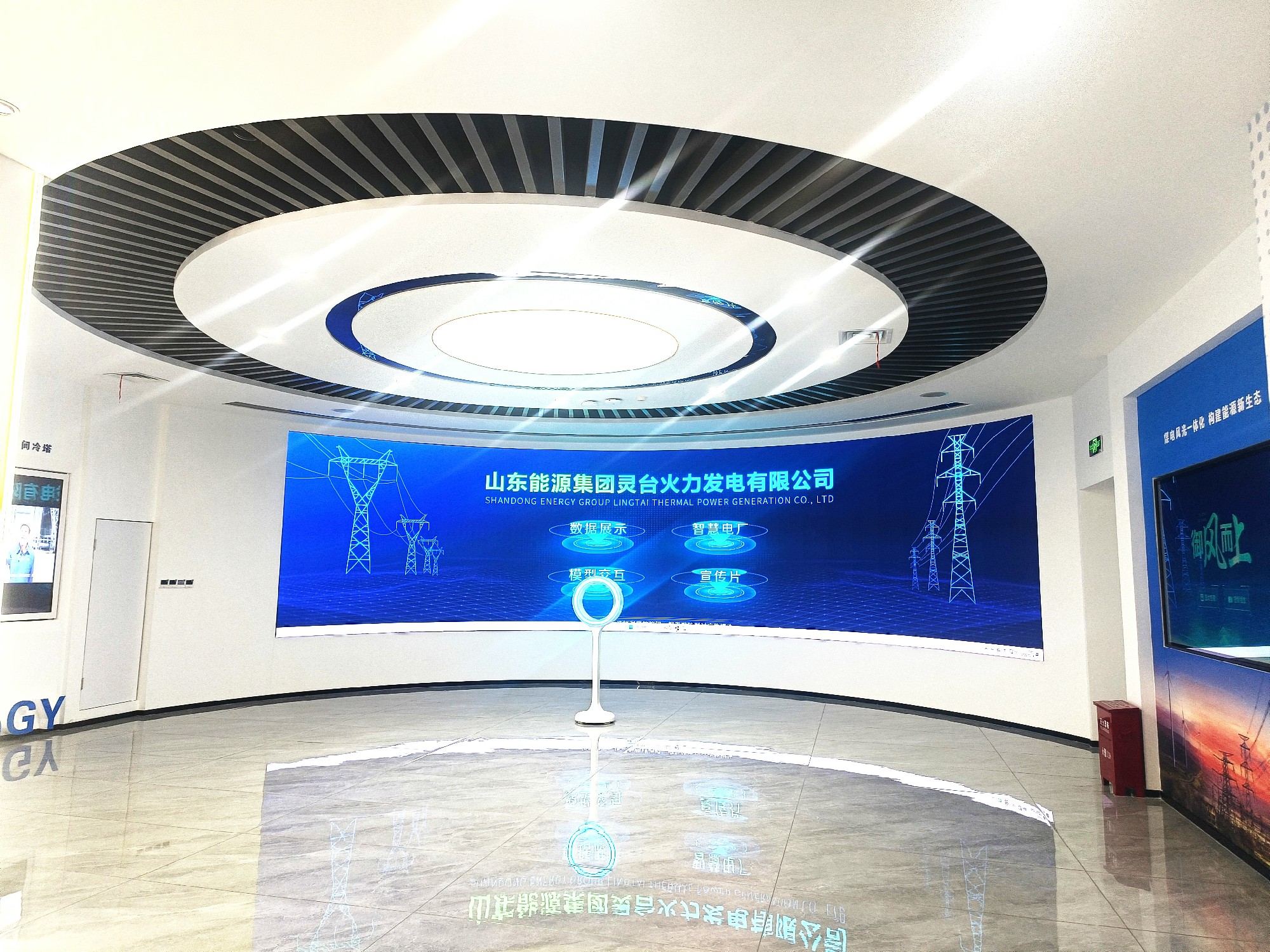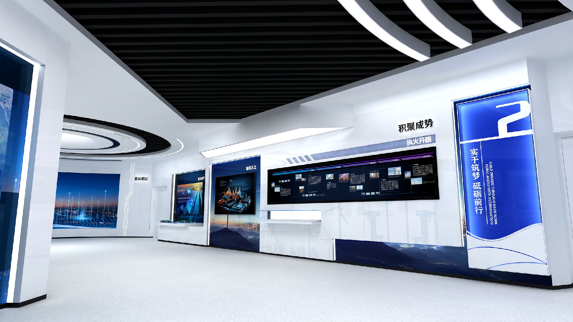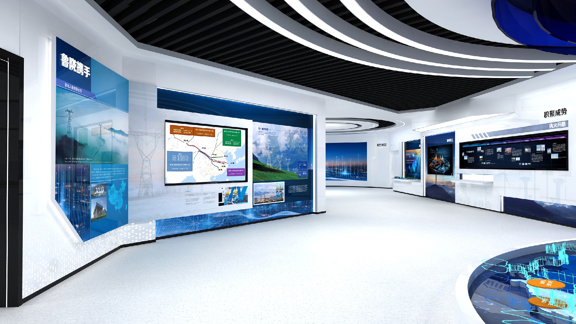 山东能源集团灵台电厂展示中心整体以蓝白为主色调,营造出简洁、清新且富有科技氛围的视觉感受。空间布局合理,通过不同形态的展示区域划分,如弧形主展墙、圆形互动区、规整的图文展板区等,引导参观者有序浏览。大量运用多媒体展示技术,如大型弧屏、互动屏幕等,结合图文展板、模型展示,全方位、多维度地呈现山东能源集团灵台电厂的相关信息,既增强了展示的趣味性与互动性,又能高效传达企业战略、发展历程、员工风采等内容。天花板的设计独特,带有科技感的图案与灯光搭配,进一步强化了空间的现代风格,