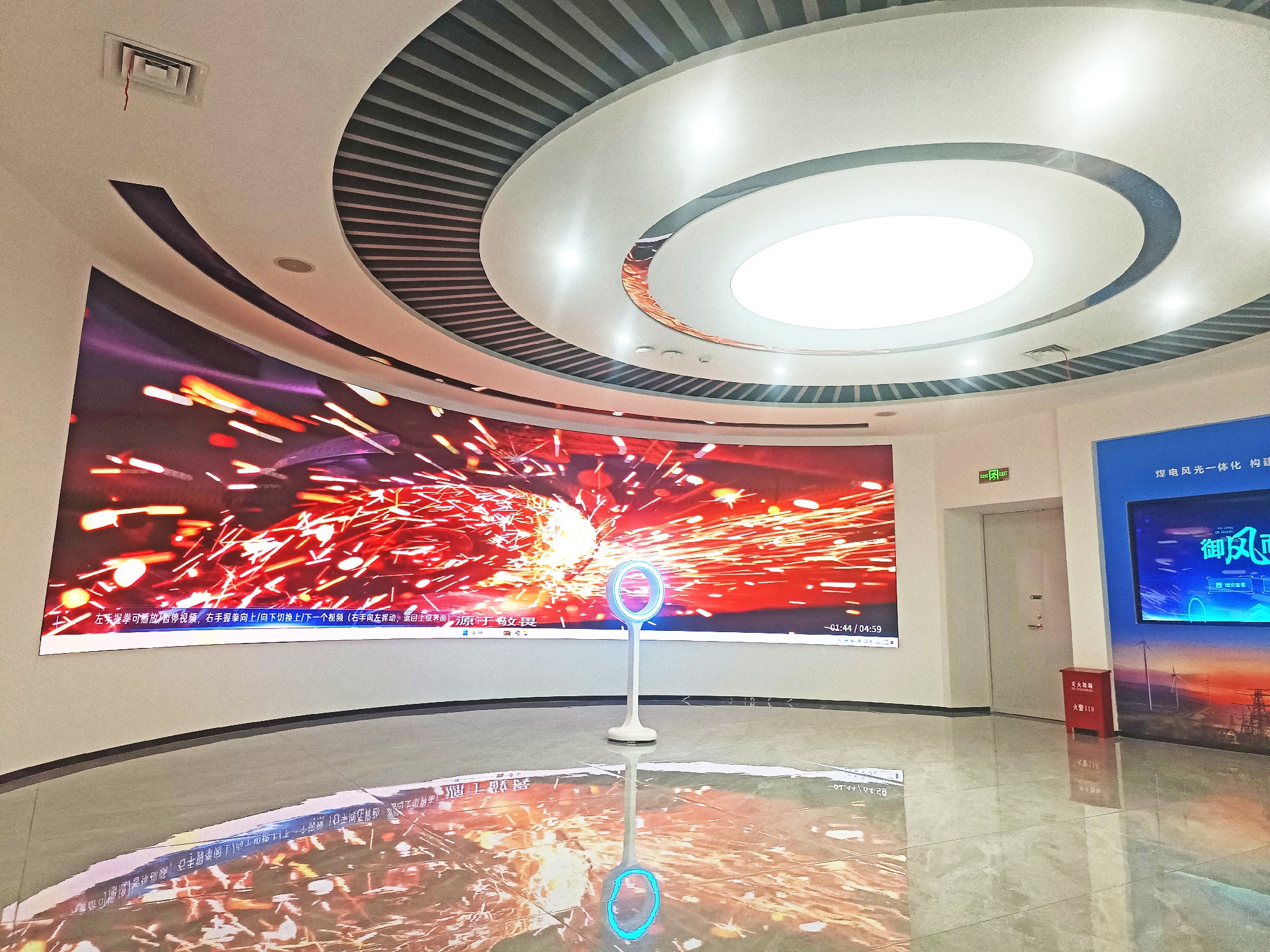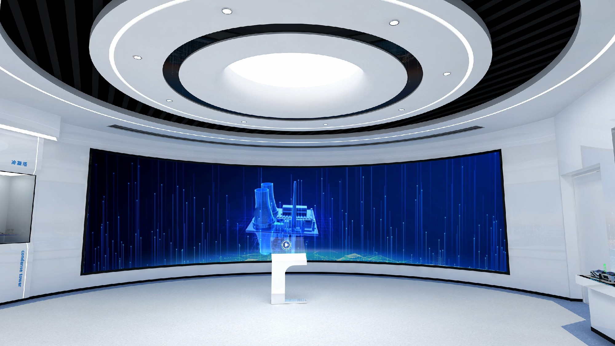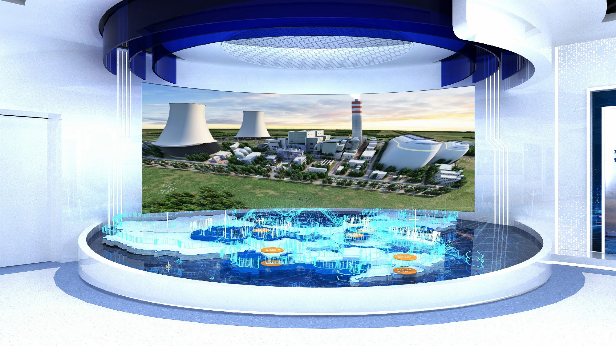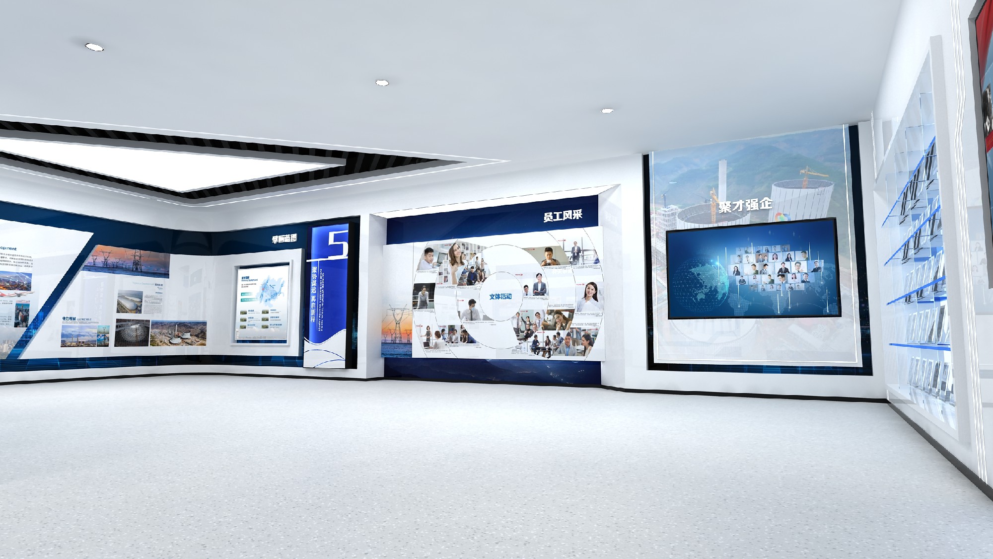山东能源集团灵台电厂展示中心整体以蓝白为主色调,营造出简洁、清新且富有科技氛围的视觉感受。空间布局合理,通过不同形态的展示区域划分,如弧形主展墙、圆形互动区、规整的图文展板区等,引导参观者有序浏览。大量运用多媒体展示技术,如大型弧屏、互动屏幕等,结合图文展板、模型展示,全方位、多维度地呈现山东能源集团灵台电厂的相关信息,既增强了展示的趣味性与互动性,又能高效传达企业战略、发展历程、员工风采等内容。天花板的设计独特,带有科技感的图案与灯光搭配,进一步强化了空间的现代风格,